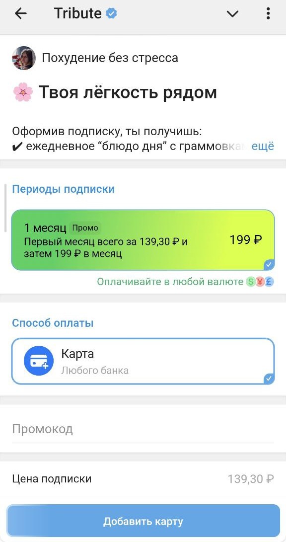 После этого Вам нужно будет добавить карту для оплаты. Первый месяц стоимость подписки будет стоить 140₽.